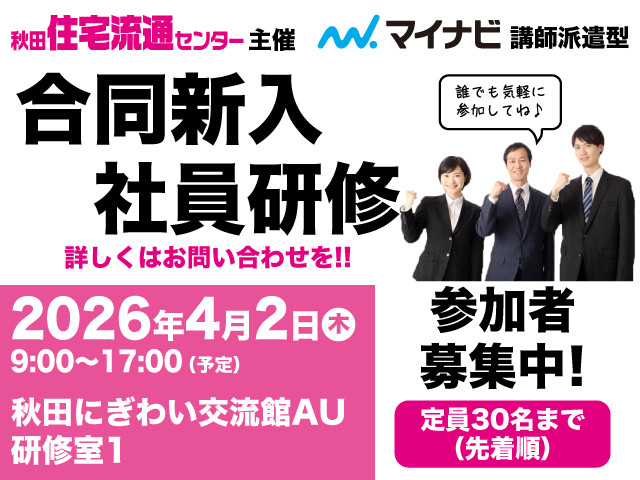 【参加者大募集!】プロによる「特別合同新入社員研修」《4/2開催》【マイナビ講師派遣型 合同新人研修】 ご担当者様 お世話になっております。 株式会社あきたタウン情報、秋田採用サポートナビチームです。 新入社員を迎える準備… 2025/12/01 企業の取り組み セミナー