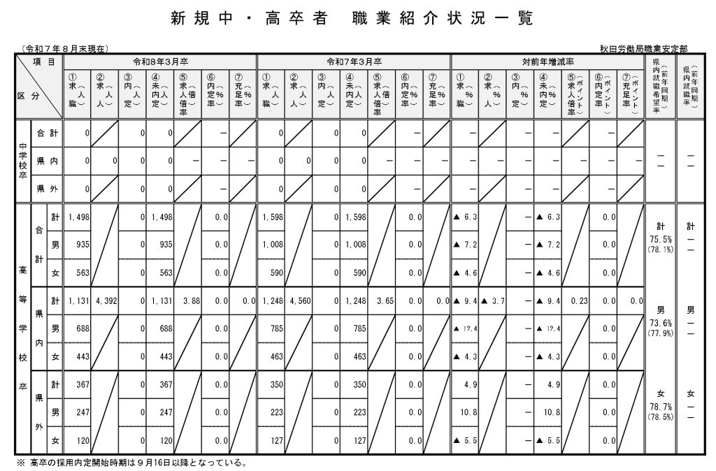 次回の秋田労働局より発表される9月末時点でのデータから、新規中・高卒者の状況が見られると思います。