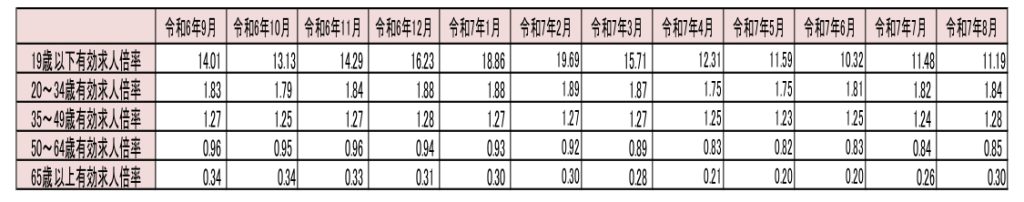 また、下の表は年齢層別の有効求人倍率の推移です。