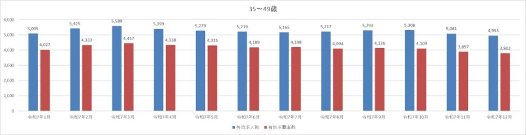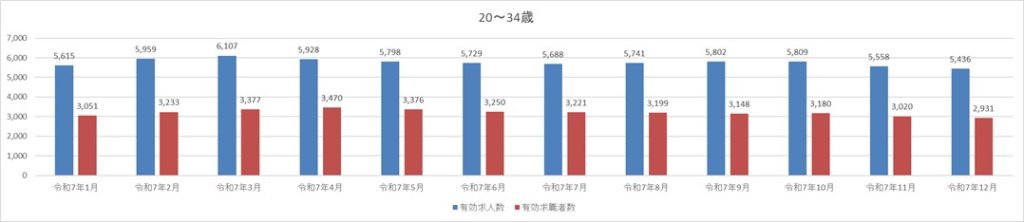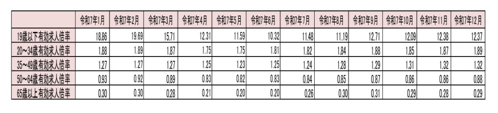 若い人ほど「仕事が見つかりやすい」状態で、特に19歳以下は求人が圧倒的に多いのが特徴です。